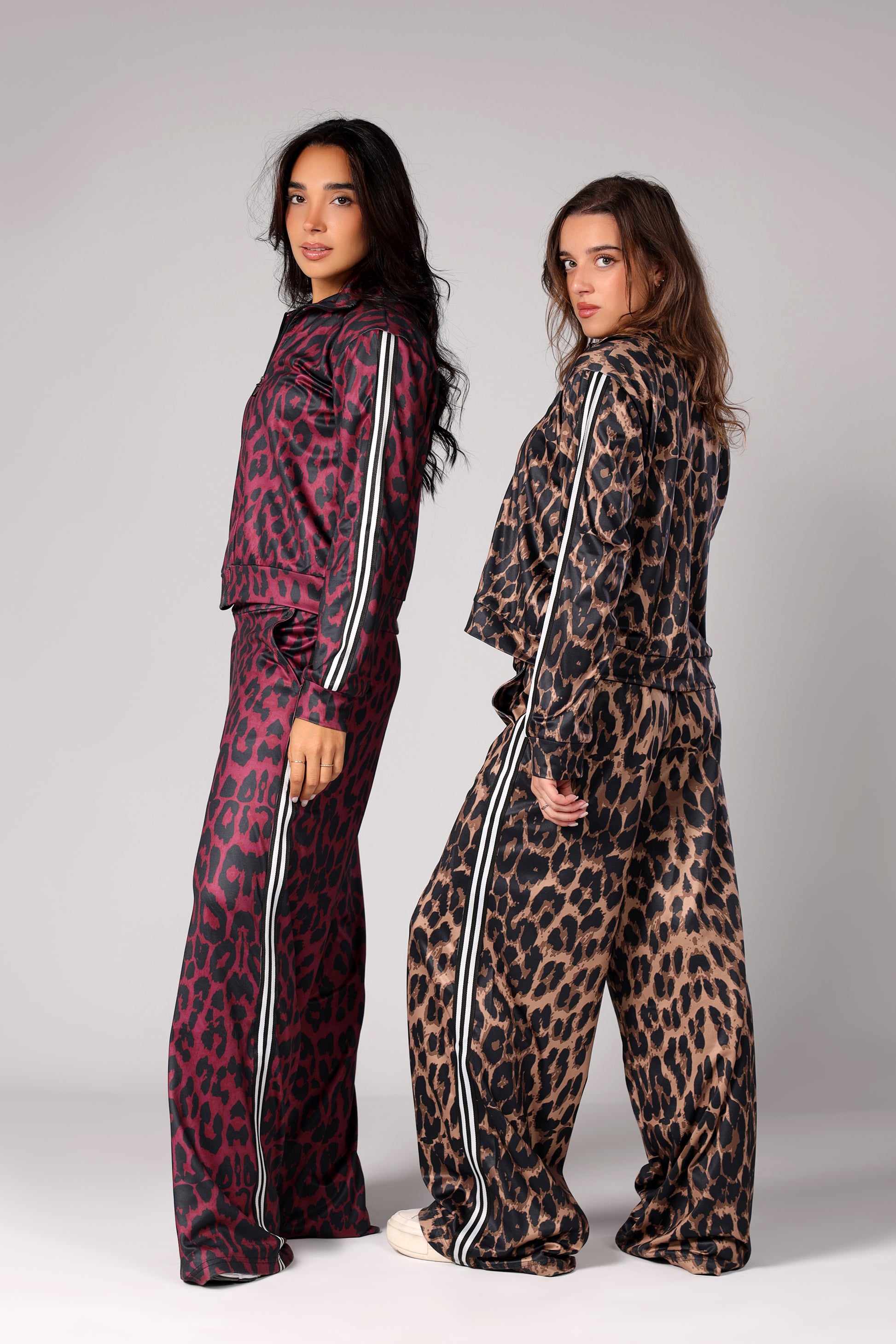 Unleash your wild side with our luxurious and comfortable Bold Leopard Tracksuit Co-ord Set. This striking two-piece ensemble features a zip-front track jacket and matching wide-leg trousers, both crafted in a rich burgundy and black leopard print. The set gets a sporty-chic update with white double-stripe detailing running down the sleeves and along the side seams of the trousers. Made from a smooth, lightweight fabric, this tracksuit is a vibrant statement piece that perfectly blends athleisure comfort with high-fashion flair.