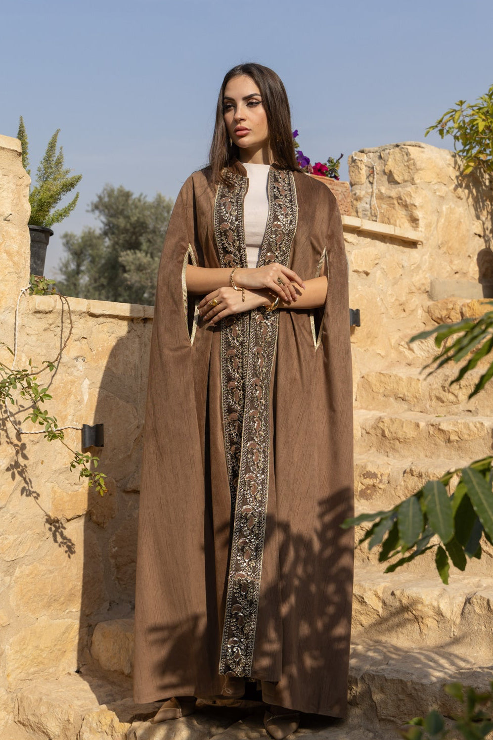 Set includes: A sophisticated cape design kaftan featuring a floor-length open-front bisht (outer cloak) and matching pants that are sold separately.