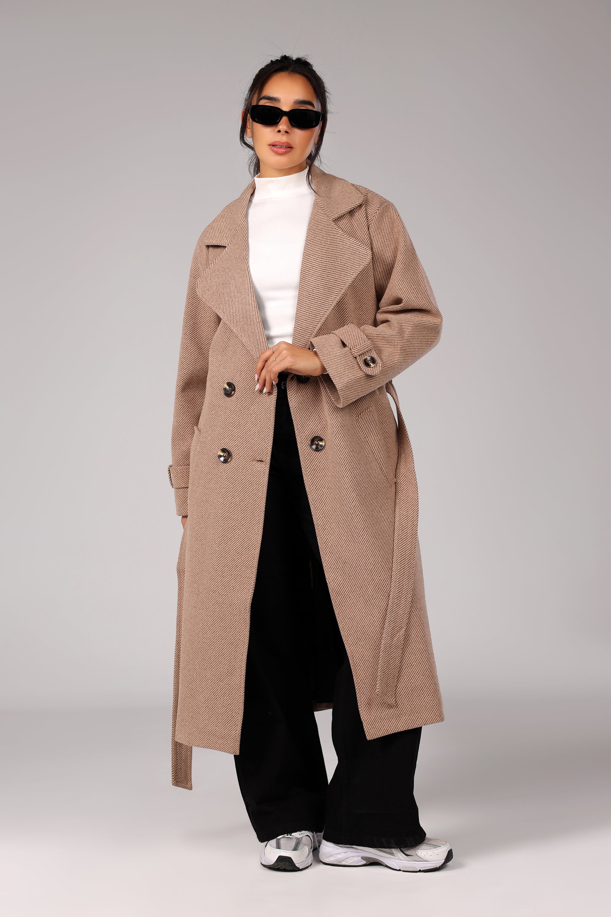 Introduce timeless elegance to your wardrobe with our Camel Herringbone Longline Coat. This sophisticated outerwear piece is crafted in a luxurious camel or light brown tone and features a subtle, refined herringbone weave that adds texture and depth to the fabric.