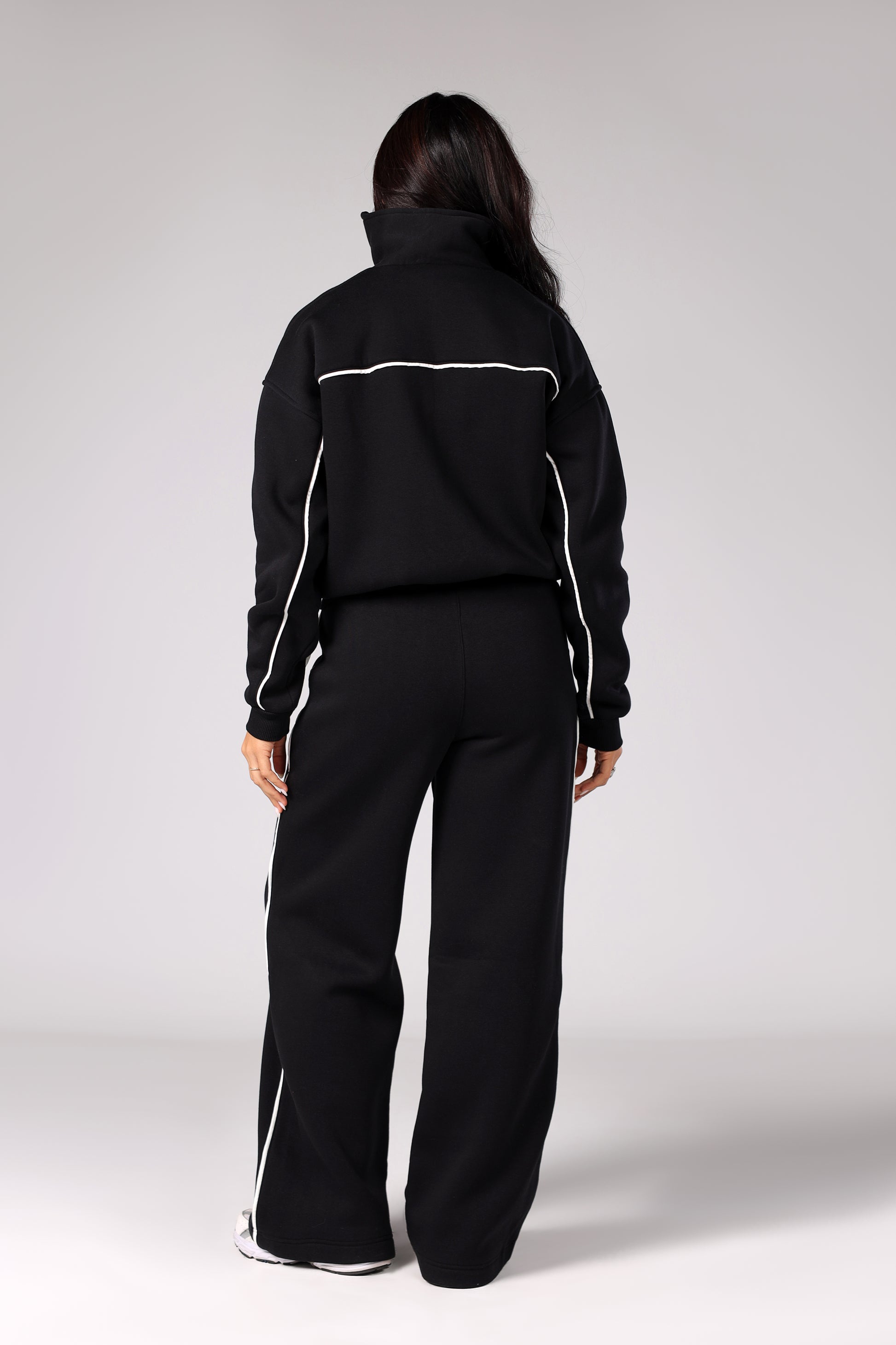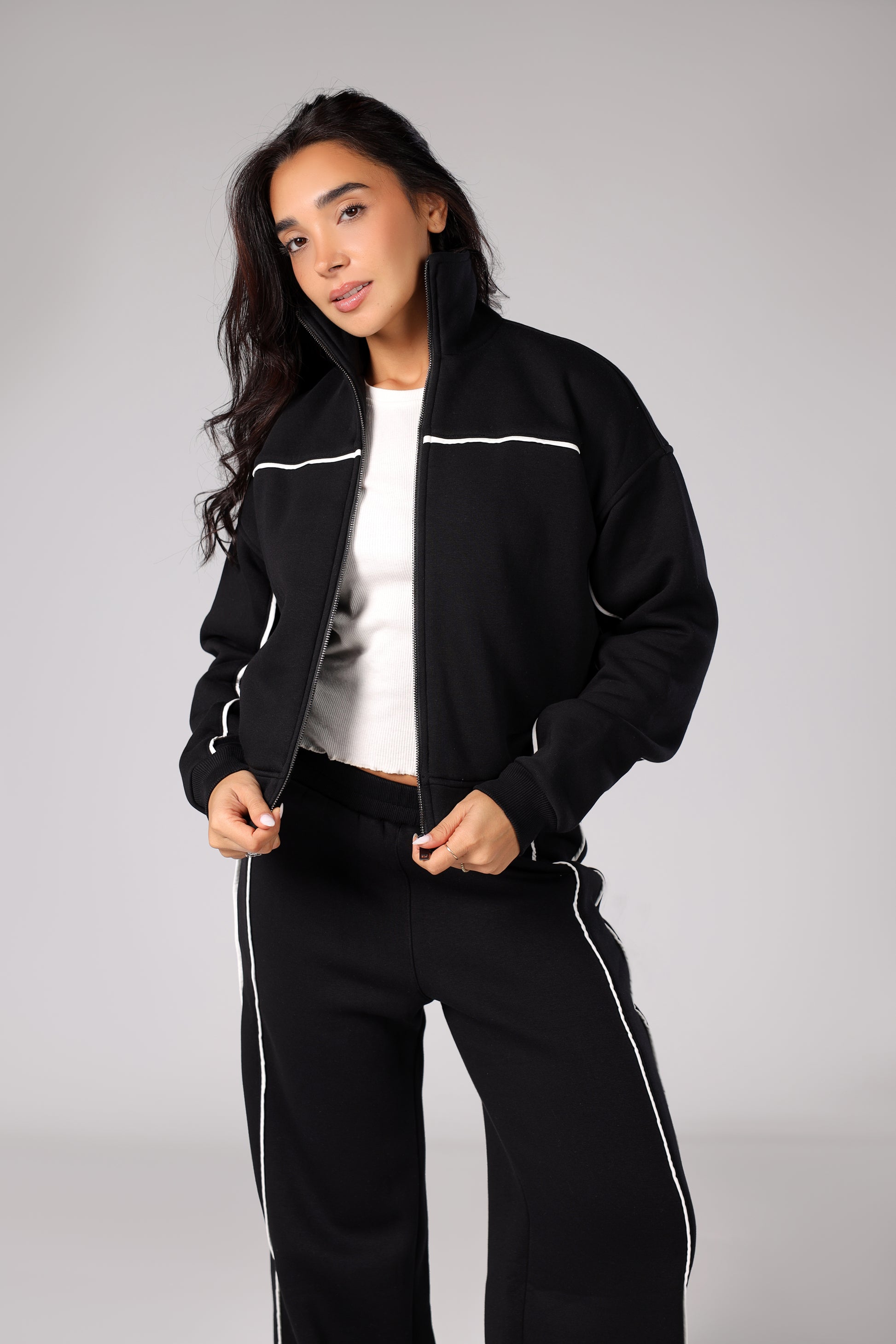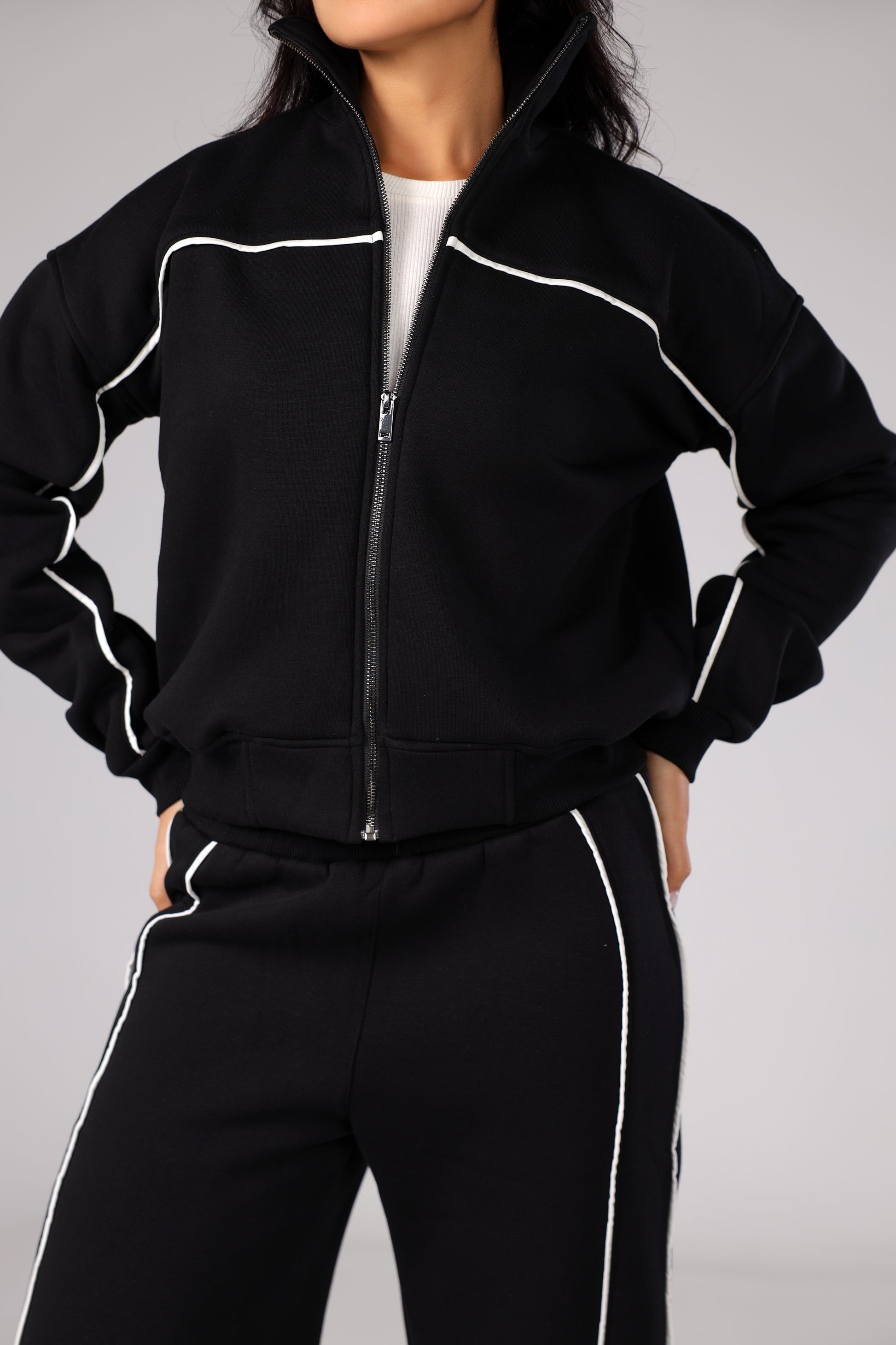 The monochrome design is elevated by crisp white contrast piping, which outlines the jacket's collar and zipper line, and boldly stripes the outer seams of the trousers. This detail creates a clean, elongated silhouette and a sporty-chic finish. Made from a thick, premium material, this set offers the ultimate combination of cozy warmth and elevated streetwear style.