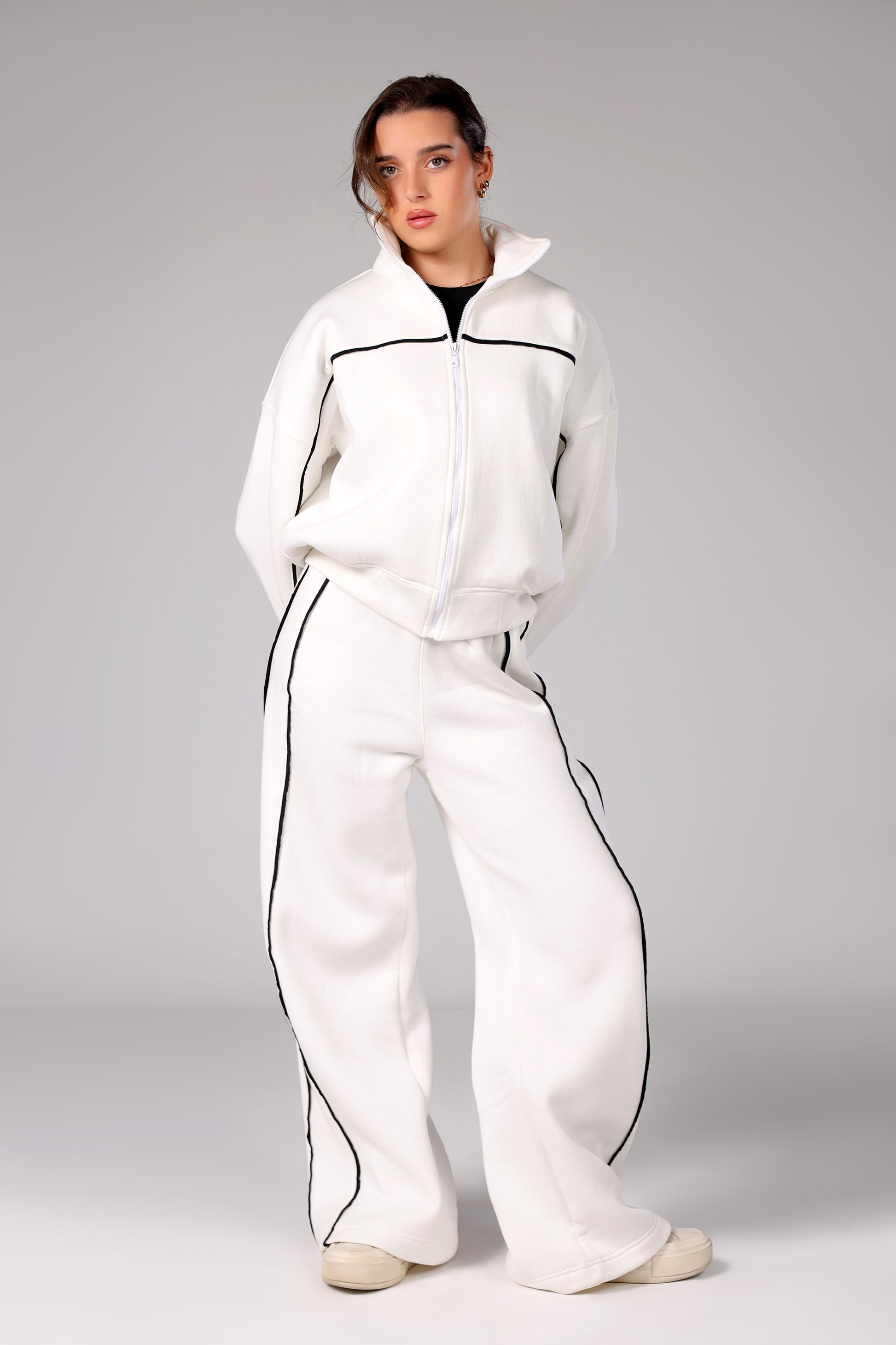 Elevate your streetwear game with our Monochrome Contrast Tracksuit Co-ord Set. This chic and minimalist two-piece ensemble features an oversized, Zip-up sweatshirt and matching high-waisted, wide-leg trousers, both in a crisp winter white fabric. The set is defined by its striking black contrast piping detail, which outlines the zipper placket and runs down the outer seams of the trousers, creating a modern, graphic silhouette. Made from a cozy, fleece-back or heavy milton material, this set is the perfect blend of luxury comfort and sporty elegance.