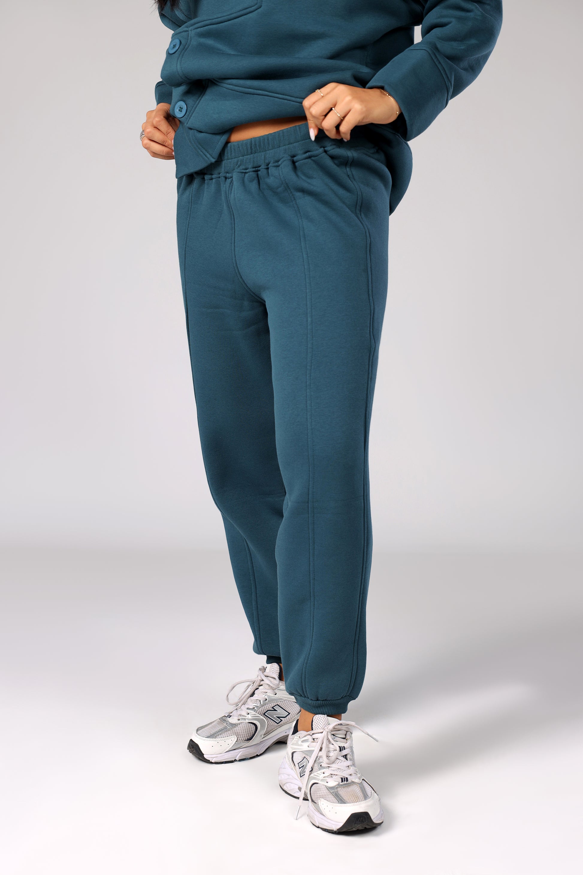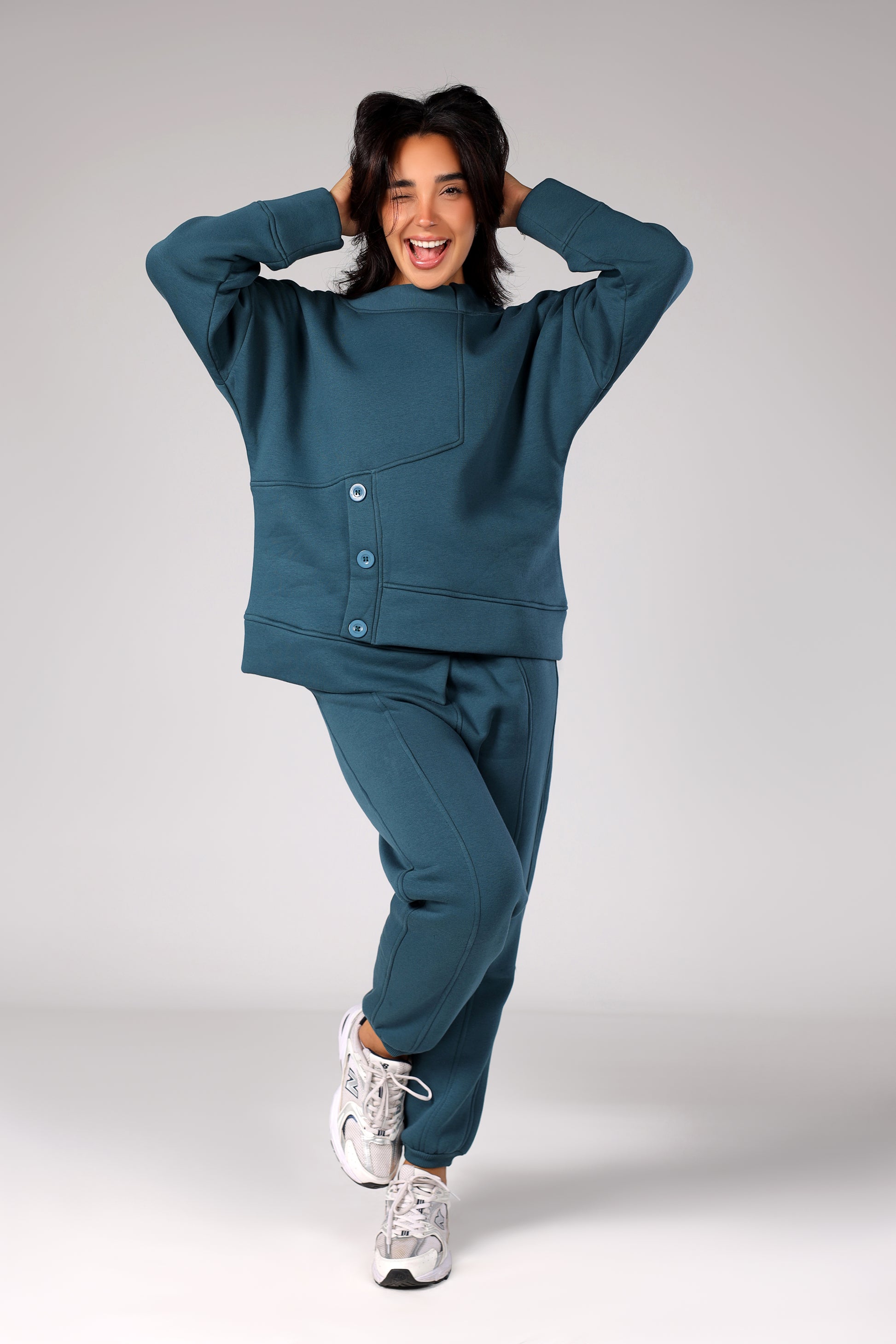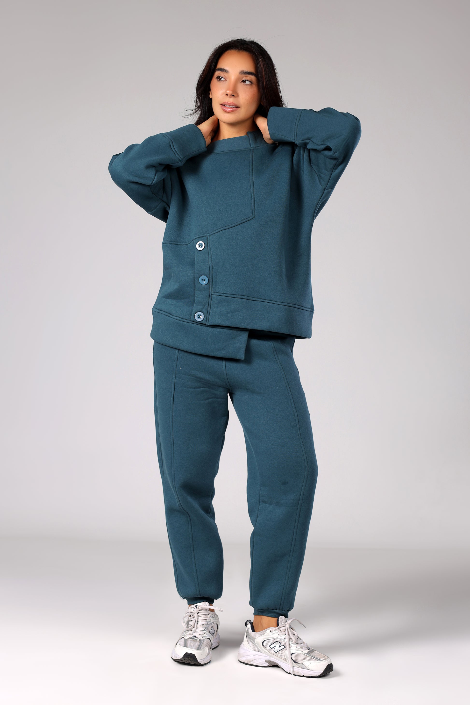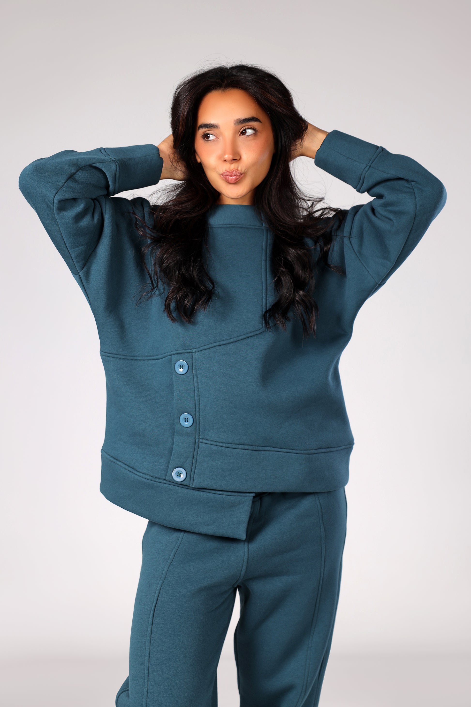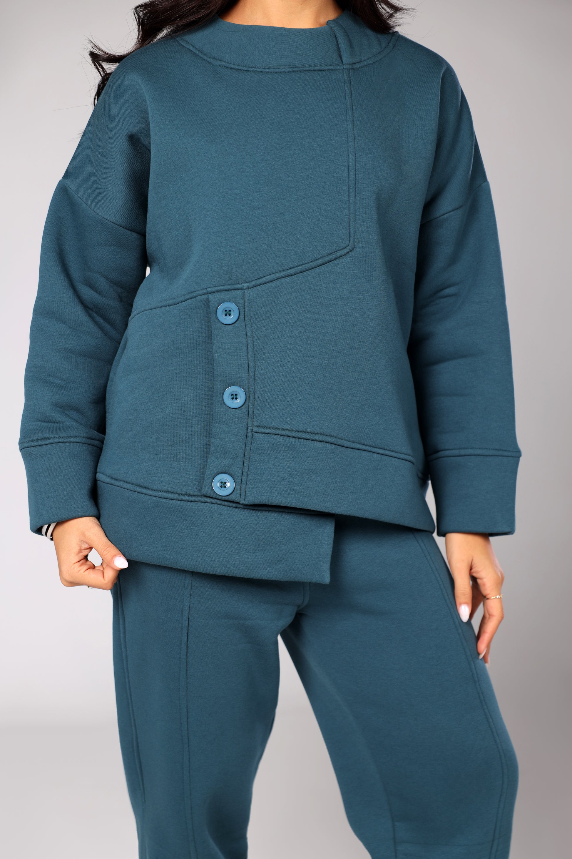Introduce architectural detail to your loungewear with our Asymmetric Teal Lounge Set. This sophisticated two-piece ensemble takes comfortable fleece-wear and elevates it with unique, contemporary design. Crafted from a soft, substantial fleece or heavy knit material in a deep, rich Teal or Petrol Blue color, this set is built for comfort without sacrificing style.