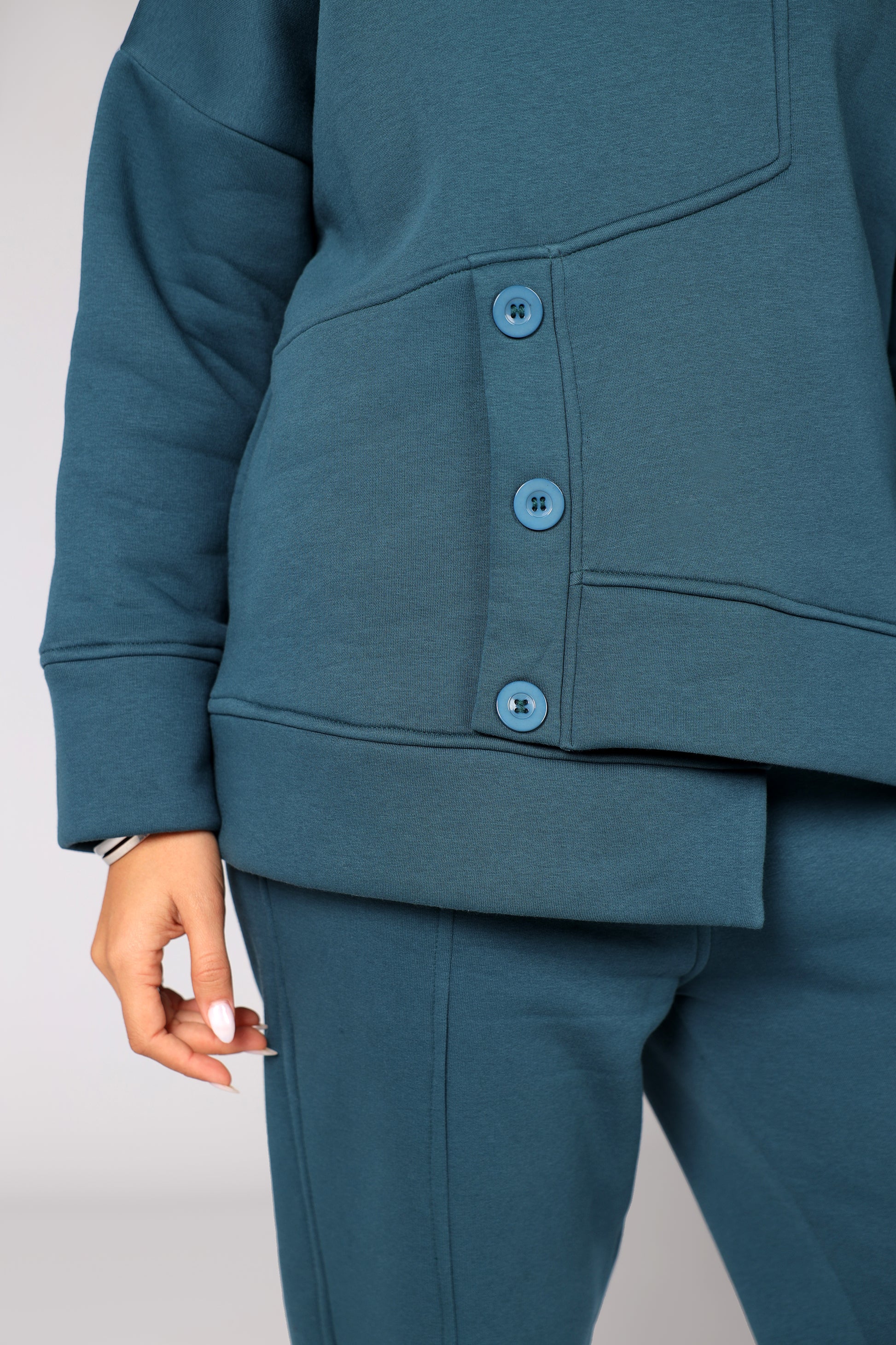 • Sweatshirt Details: Crew neck (or slight mock neck), long sleeves, and a unique asymmetric layered hemline. Features an external patch pocket and decorative off-center buttons in a contrasting color (likely a light grey or cream).