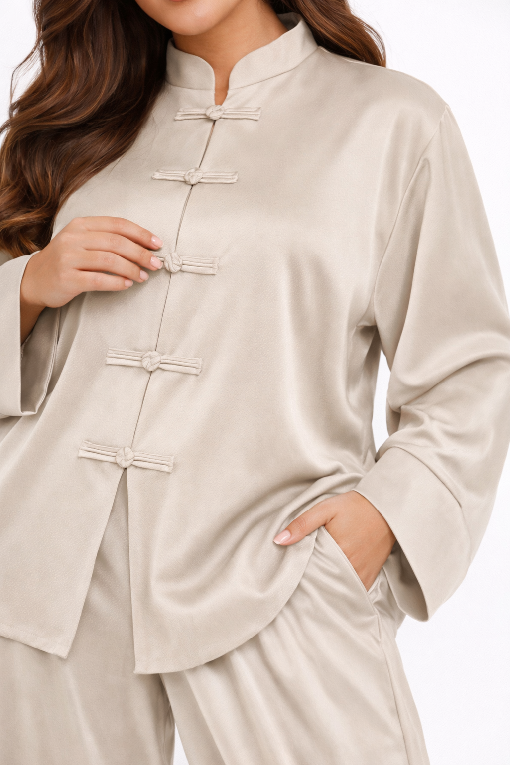 Loose-fit top with mandarin collar and handcrafted knot button closures, paired with relaxed tapered pants featuring an elasticated hem, high waist, and side pockets.