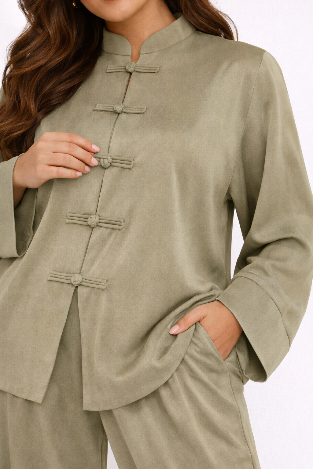Loose-fit top with mandarin collar and handcrafted knot button closures, paired with relaxed tapered pants featuring an elasticated hem, high waist, and side pockets.