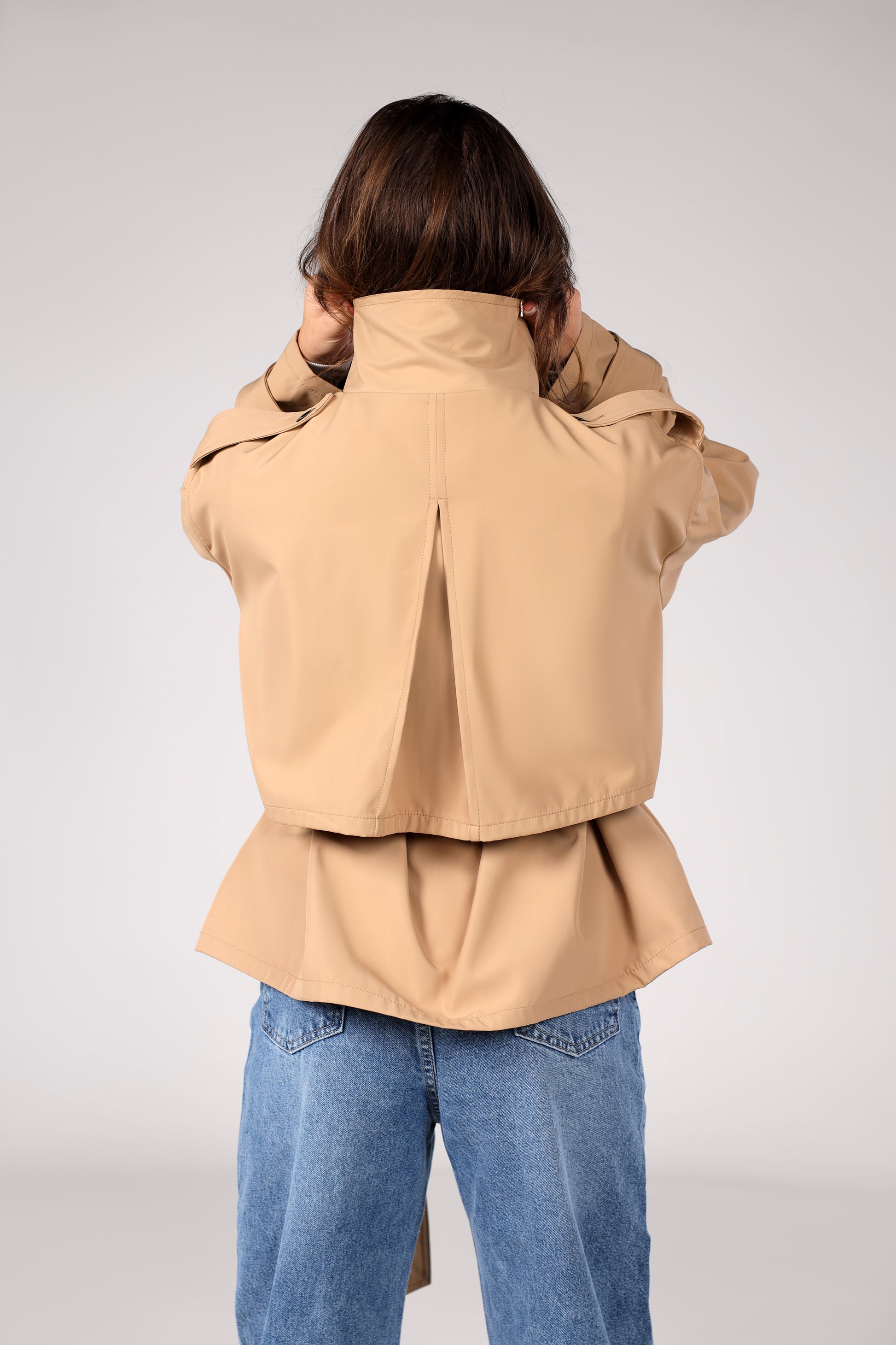 Introducing our Belted High-Neck Utility Jacket, a chic and contemporary update to the classic military- or trench-inspired outerwear. Crafted in a versatile camel or tan colored technical fabric, this jacket is designed with functional yet stylish detailing.
