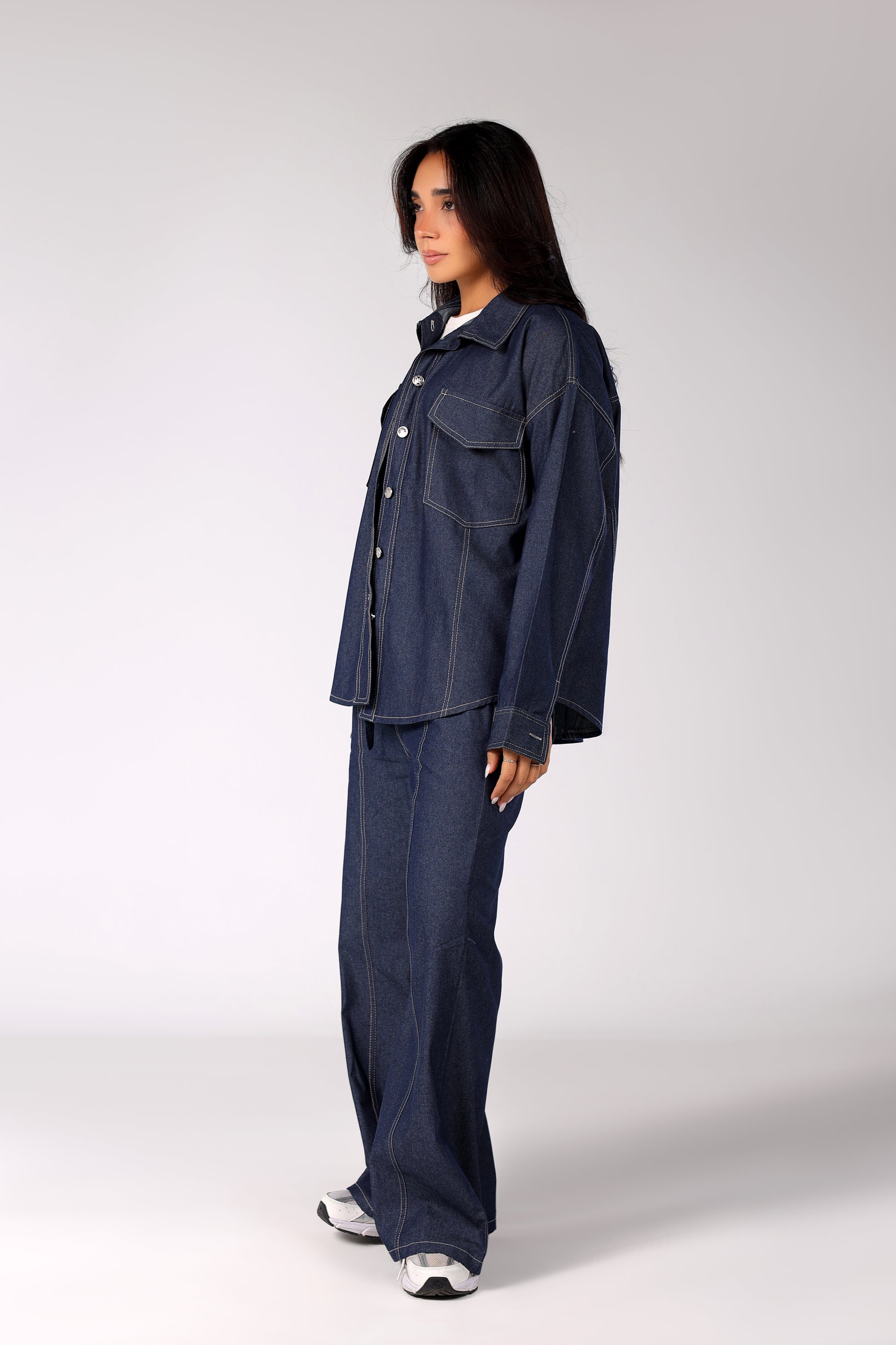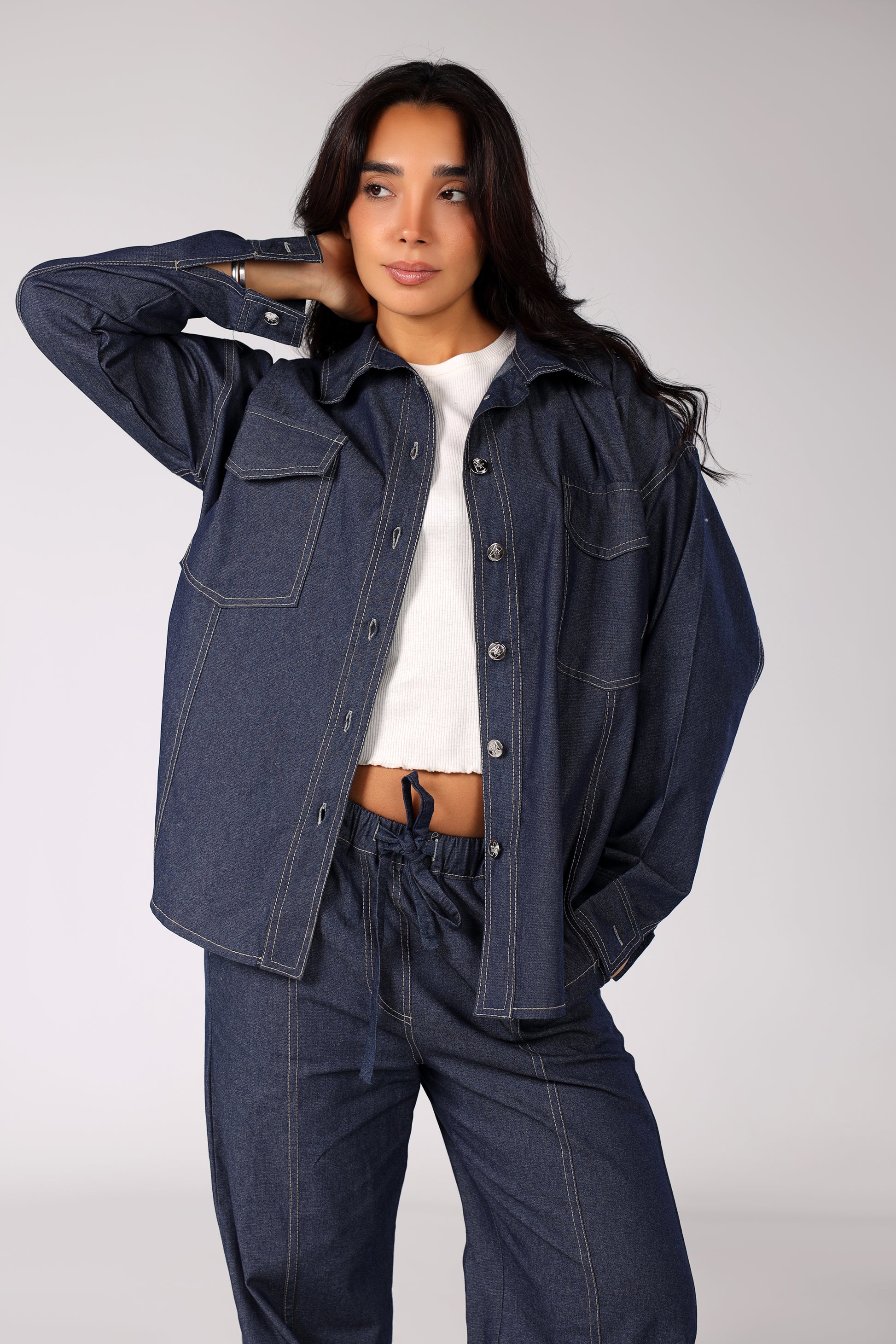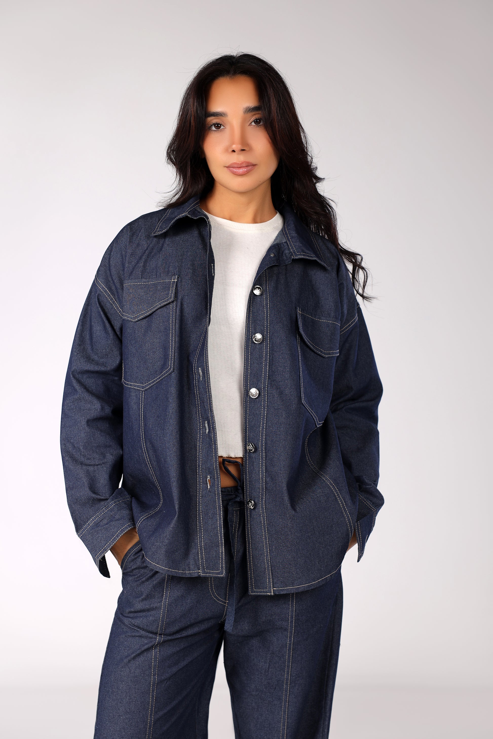 Get the ultimate denim-on-denim look with our effortlessly cool Deep Indigo Denim Co-ord Set. This two-piece ensemble features an oversized utility-style shirt with dual chest pockets and a high-waisted, wide-leg trouser with striking vertical contrast stitching. Made from a sturdy, dark-wash denim, this set combines a laid-back, modern fit with a touch of vintage flair for a versatile, statement-making outfit.