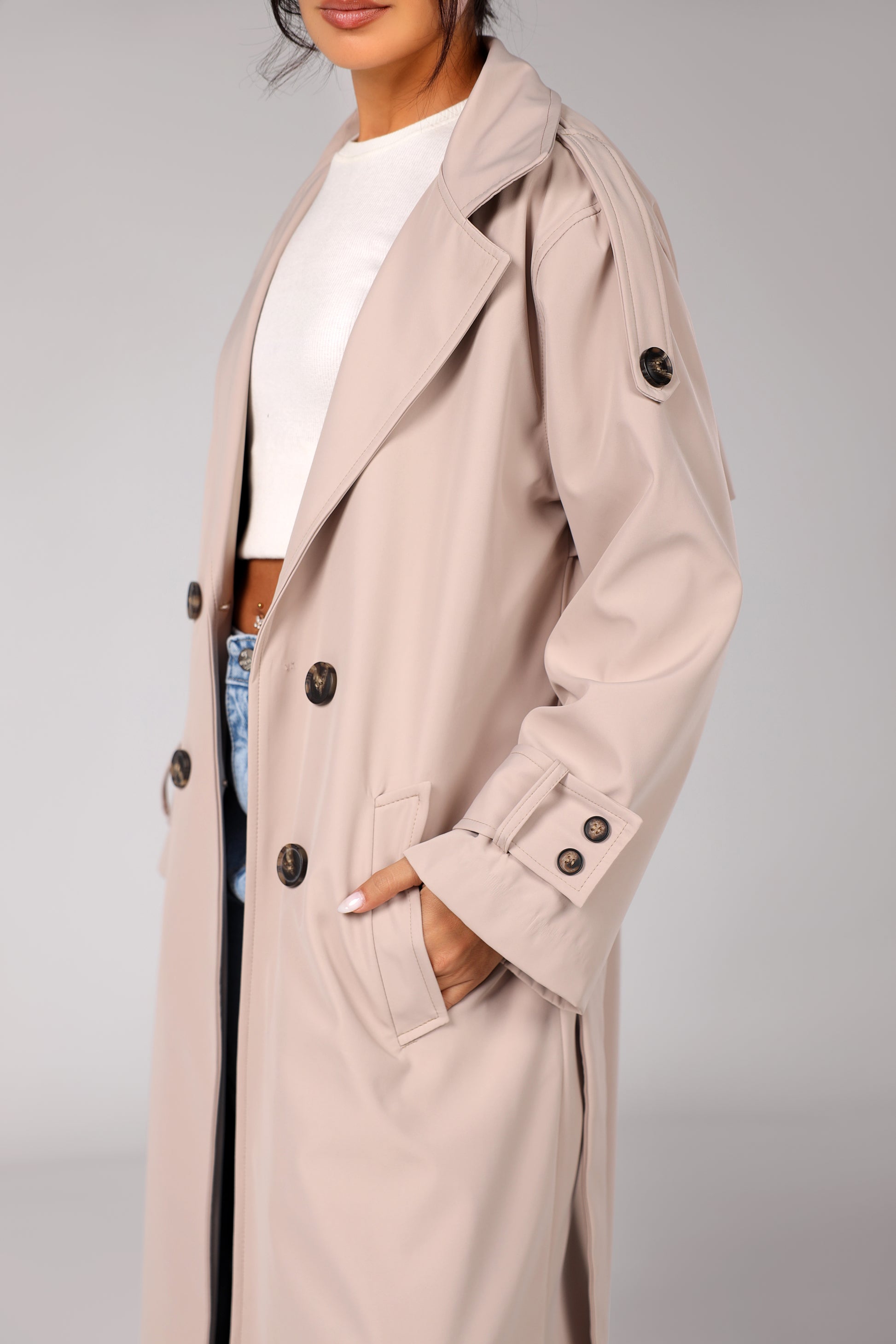 The Classic Maxi Trench Coat is a timeless piece of outerwear, perfected for the modern wardrobe. Crafted from a smooth, flowing technical fabric in an elegant pale beige color, this coat drapes beautifully to a maxi or mid-calf length, offering a dramatic and sophisticated silhouette.